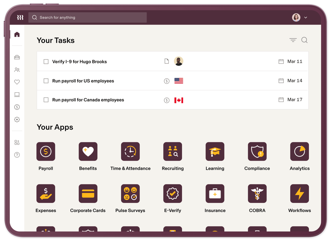 - Global payroll processing across the US and 50+ countries, with automated tax filing and compliance management