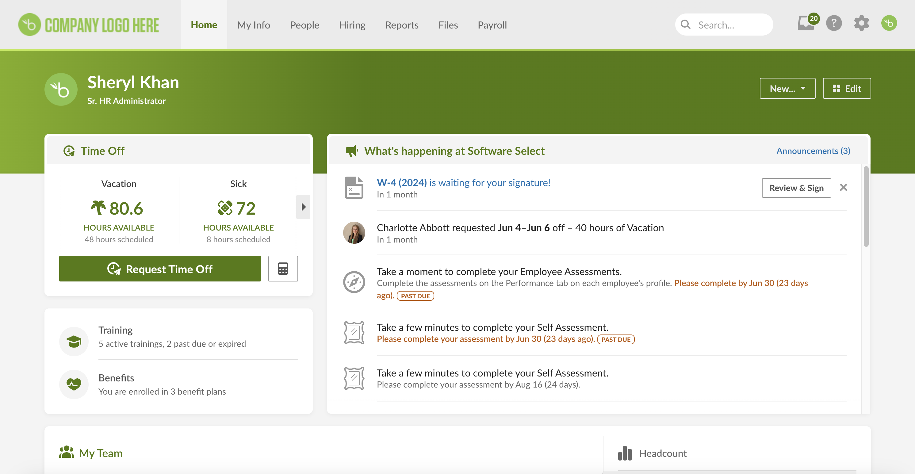 - Centralizes everyday HR tasks in a clean, logically organized layout that HR teams and employees both find easy to navigate