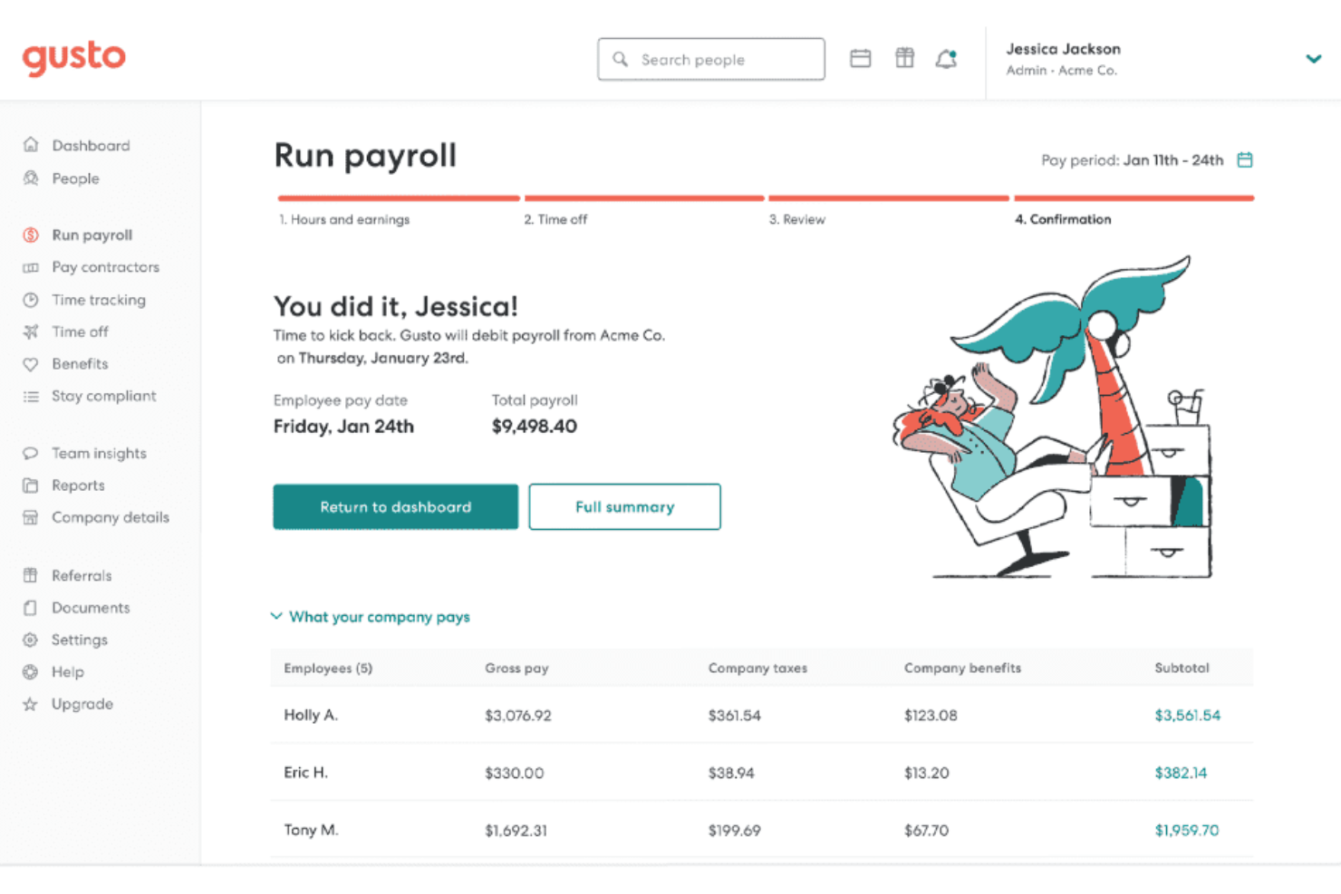 - People analytics with customizable dashboards, headcount forecasting, and AI-powered reporting